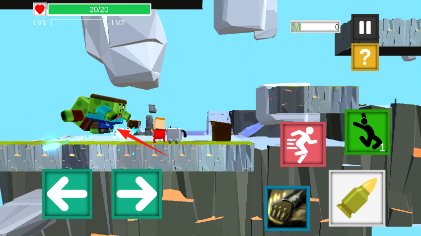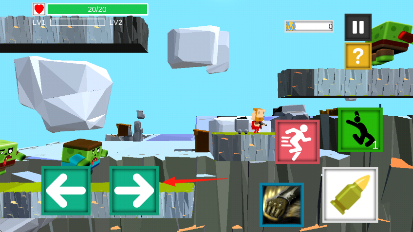 2、通过左右箭头控制角色行进,靠近绿色僵尸敌人,进入战斗范围,同时留意场景中的落石等危险。