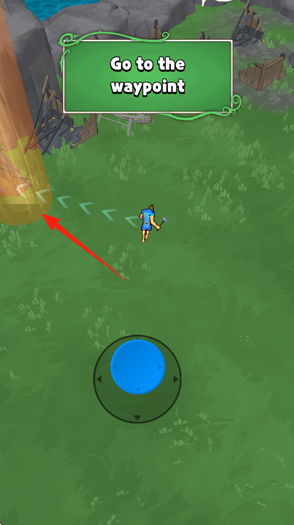 1、依据提示Gotothewaypoint,操控下方蓝色摇杆,引导英雄沿着箭头指向的路径,前往绿色方框标记的路点。