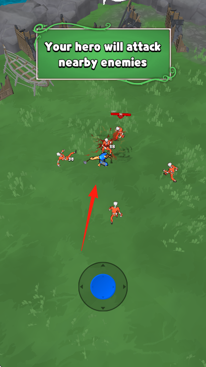 2、按Yourherowillattacknearbyenemies指引,操控摇杆移动英雄,使其自动攻击周围橙色敌人,推进战斗。