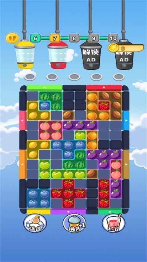 1、创新融合华容道机制,以水果移动为核心玩法,突破传统消除模式,带来全新解谜体验。玩家需规划路径,将水果精准送入榨汁机。