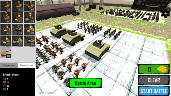 1、单位购买部署:玩法简洁,拥有资金可用于购买战斗单位,选择要购买的单位后,点击对应区域进行部署,通过3D视图查看军队部署情况,确认后点击开始战斗按钮。
