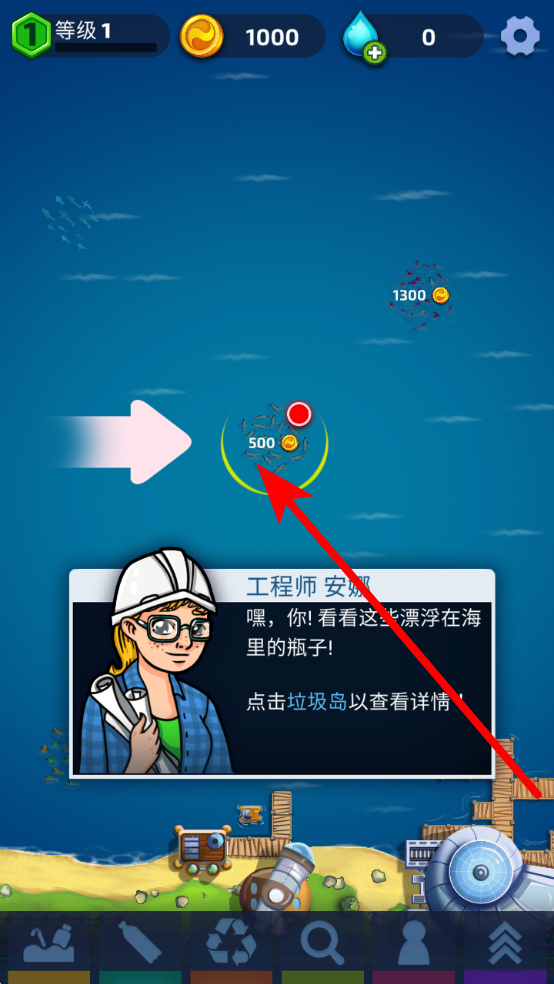 1、进入游戏后,像图中这类有提示的垃圾岛,点击它查看详情,了解可收集垃圾种类和数量,开展海洋清洁工作的重要一步,为后续收集和处理垃圾奠定基础。