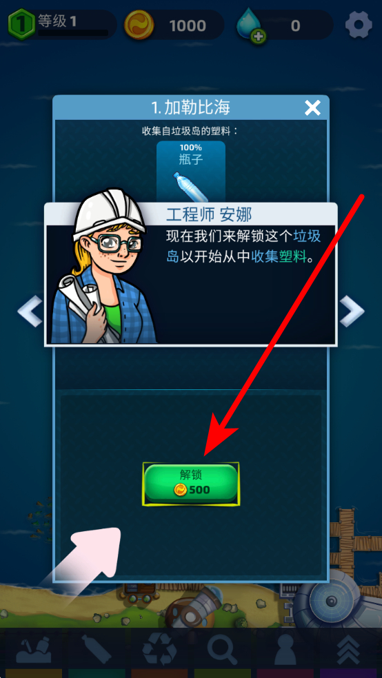 2、当遇到可解锁的垃圾岛时,如拥有足够金币,就点击解锁按钮,解锁后便能开始从中收集塑料等垃圾资源,扩大海洋清洁的范围和规模,推进环保进程。