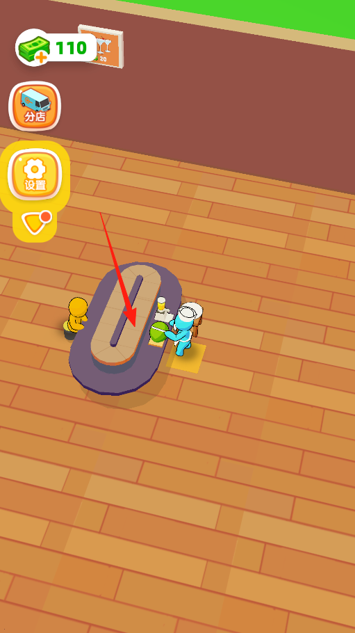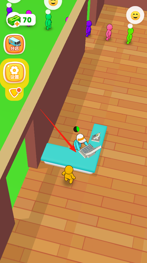 3、顾客在店里消费完,会走到蓝色收银台结账,每收一笔,你就赚一笔金币,多招呼些顾客来,让收银台一直有生意,金币就能源源不断进账,好升级更多设施。