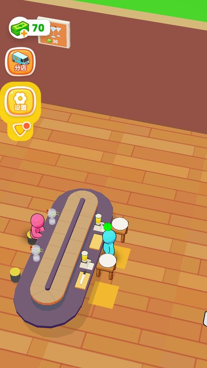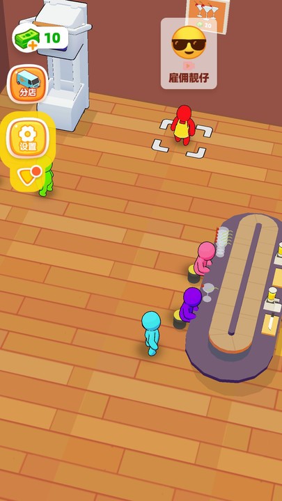 2、吧台建好后,蓝色小人会在吧台这儿忙活,给黄色顾客上餐,你得盯着点,保证小人及时服务,别让顾客等太久,顾客满意了,才会给你金币,用来继续升级店铺。