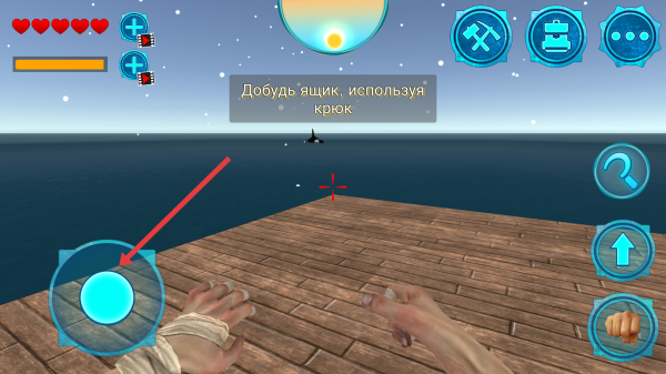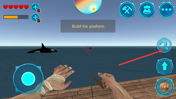 2、在移动过程中,留意屏幕上的提示信息,根据提示进行操作,完成相应的任务,使用钩子,勾住水面上的木板收集物品、建造平台等。