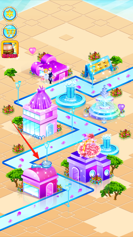 1、进入浪漫小镇场景,有好多漂亮建筑,想体验美发店玩法,就点箭头指的粉色小房子,进入建筑开启美发、换装等有趣互动,逛逛小镇其他地方,探索不同建筑功能。