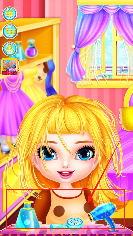 2、到美发店啦,桌上有洗发水吹风机这些工具,先选洗发水给角色洗头,再用吹风机吹干,一步步操作,把角色头发弄成喜欢的样子,感受美发乐趣。