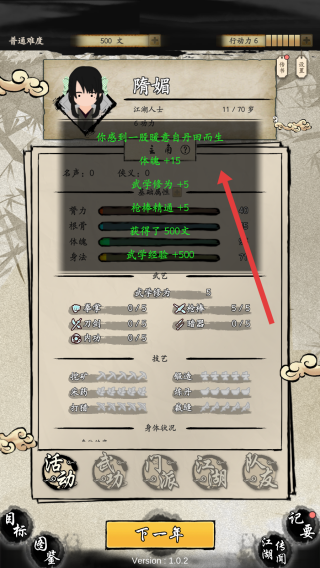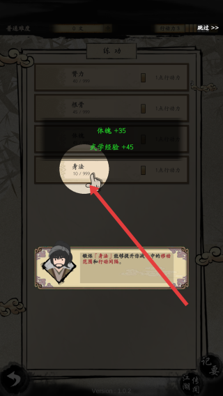 1、进入练功情节的界面,优先分配行动力到身法等属性,提升战斗移动优势,消耗行动力升级。