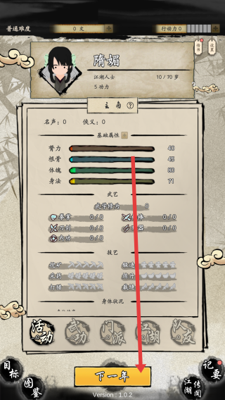 2、在角色的界面里,关注隋媚属性的成长,每年结束点下一年推进时间,些许解锁战斗的技能。