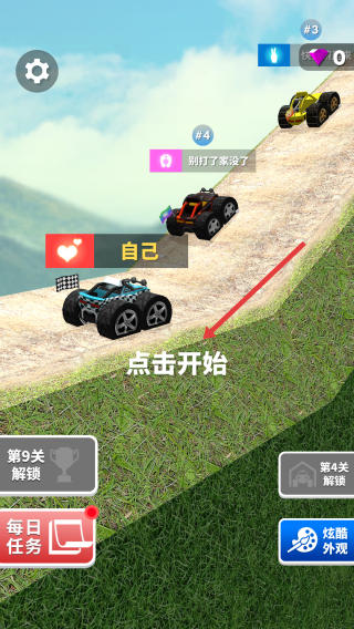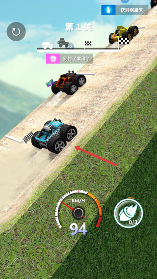 2、在行驶过程中,通过点击屏幕控制车辆的速度和方向,在赛道上行驶,努力超越其他车辆,率先到达终点。