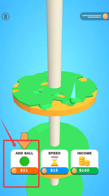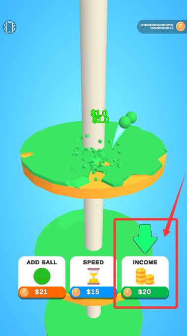 1、启动游戏后,先点击收益提升按钮,再增加小球数量强化破坏效果。