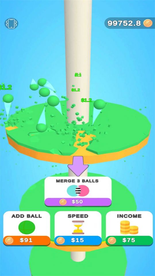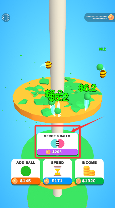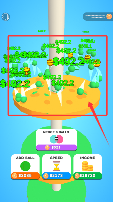2、积攒足够金币后,使用三球合并功能提升单个小球的冲击力。