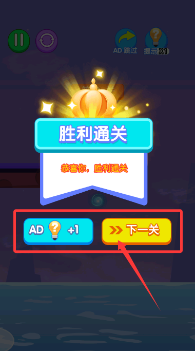 4、完成当前关卡后,点击继续按钮解锁更具挑战性的后续关卡内容。