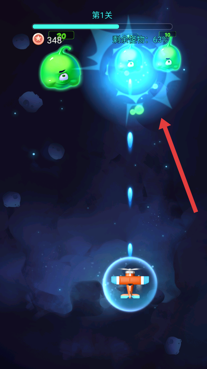 1、进入游戏后的第1关开局,需要跟随提示进行滑屏操控飞机,向怪物发起射击,熟悉攻击操作。