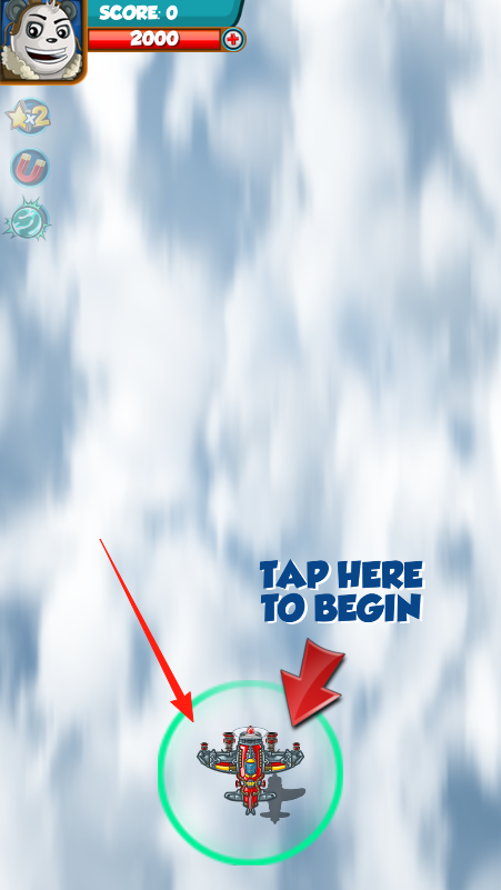 1、进入游戏开场,看到飞机和点击此处开始提示,点飞机位置开始,之后飞机就会飞起来,进入空战,躲子弹、打敌人,争取拿高分。
