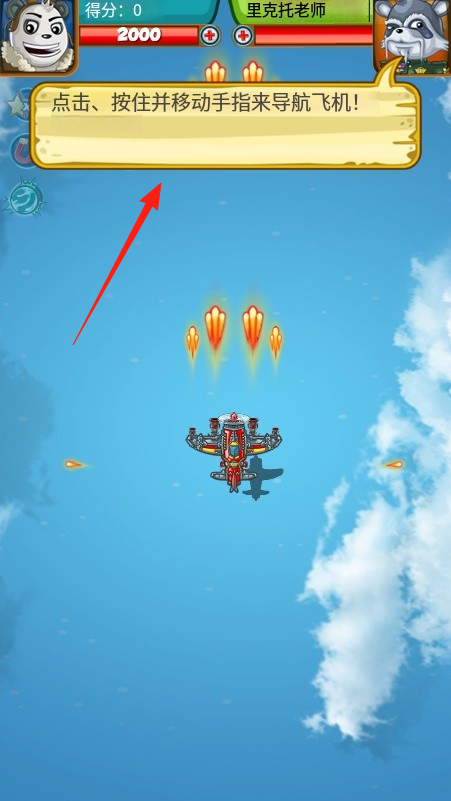2、游戏里弹出提示,教你点击、按住并移动手指来导航飞机,按这方法操作,拖着飞机躲导弹调整位置,对准敌人发射子弹,和对手里克托老师战斗。