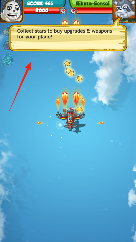 3、飞着飞着出现新提示,说收集星星来购买升级道具和武器,看到星星就去吃,攒够星星后,能给飞机买更强武器升级性能,让飞机更厉害,好打更难的关卡。