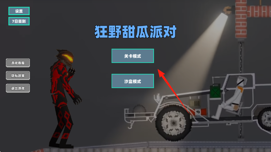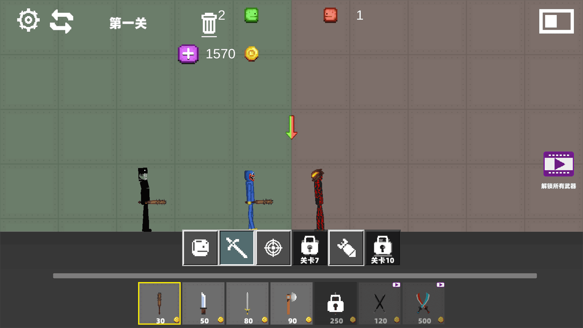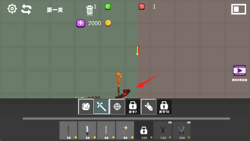 1、主界面选关卡模式,进入第一关,操控角色橙色人物,下方选武器。
