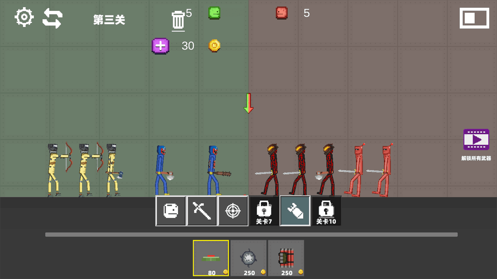 3、成功击败敌人,推进关卡,可继续解锁新武器、挑战后续关卡,积累金币升级装备。