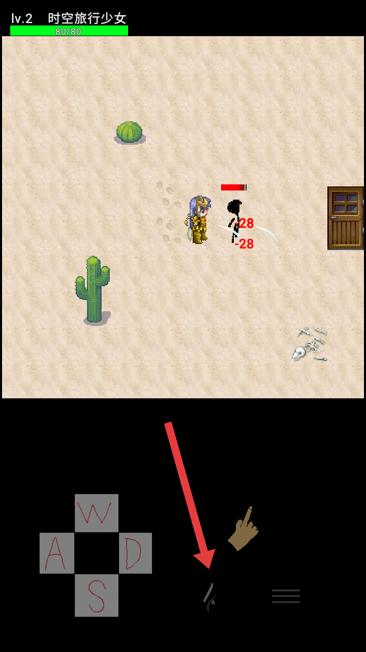2、点击下方剑形攻击的图标,对单个敌人发起攻击,造成伤害如-28,优先消灭近身的敌人。