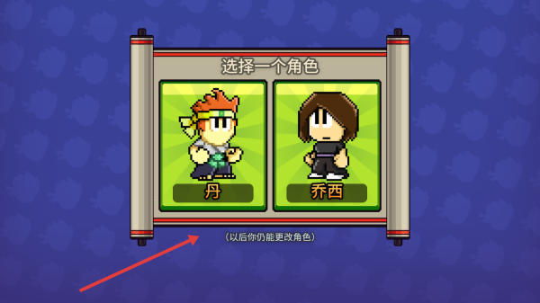 1、在角色选择界面,可选丹或乔西,确认后进入像素风横版冒险场景,开启闯关。