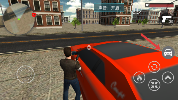 3、靠近车辆点击右侧汽车的图标,进入红色车辆,借助车辆提升移动速度,辅助我们快速找到歹徒。