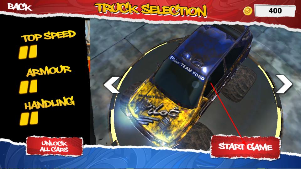 1、在卡车选择界面,查看左侧TOP SPEED极速、ARMOUR护甲、HANDLING操控属性,选定卡车后点击右侧START GAME按钮,正式进入越野赛道。