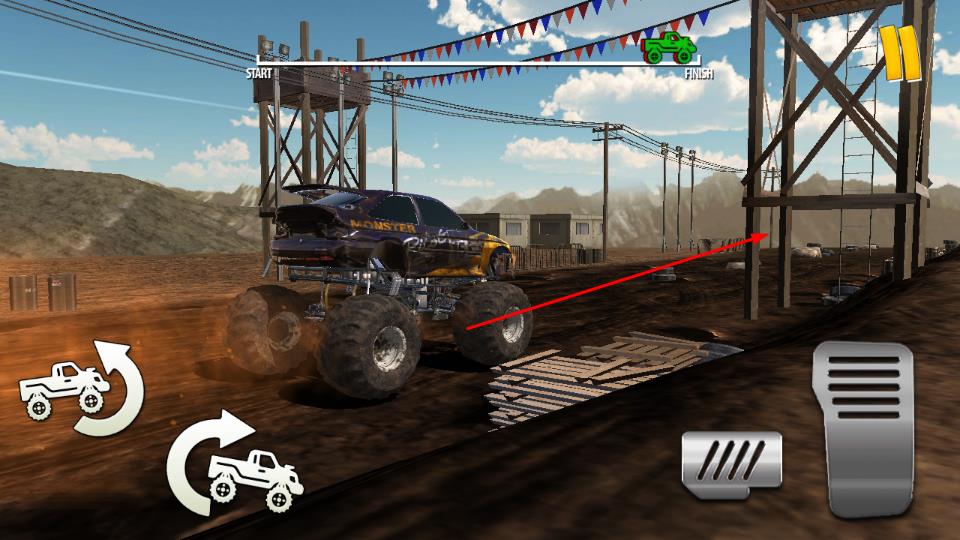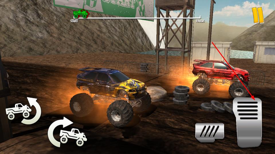 2、右侧踏板图标控制卡车加速,左侧两个旋转箭头按键分别调整车身方向与姿态,根据赛道地形如土坡、障碍灵活操作,应对颠簸路况。