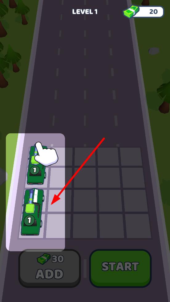 1、进入关卡前,点击ADD消耗金币购置车辆,拖放至网格空位,相同等级的车辆相邻可合并升阶,解锁更高等级的外观与攻击能力。