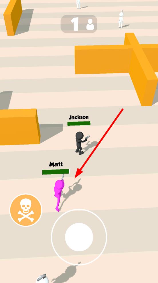 1、进入关卡,操控粘液角色移动,靠近白色小人时释放粘液附身,获取初始身份,将自动获得武器,正式开启竞技首战。