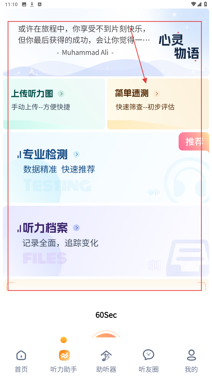 1、打开应用,在【听力助手】页面,点击【简单速测】进行初步评估。
