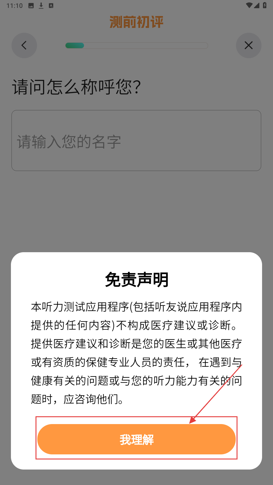 2、进入测试页面,认真查看免责声明,查看完成点击【我理解】后跟随真实情况进行测试。