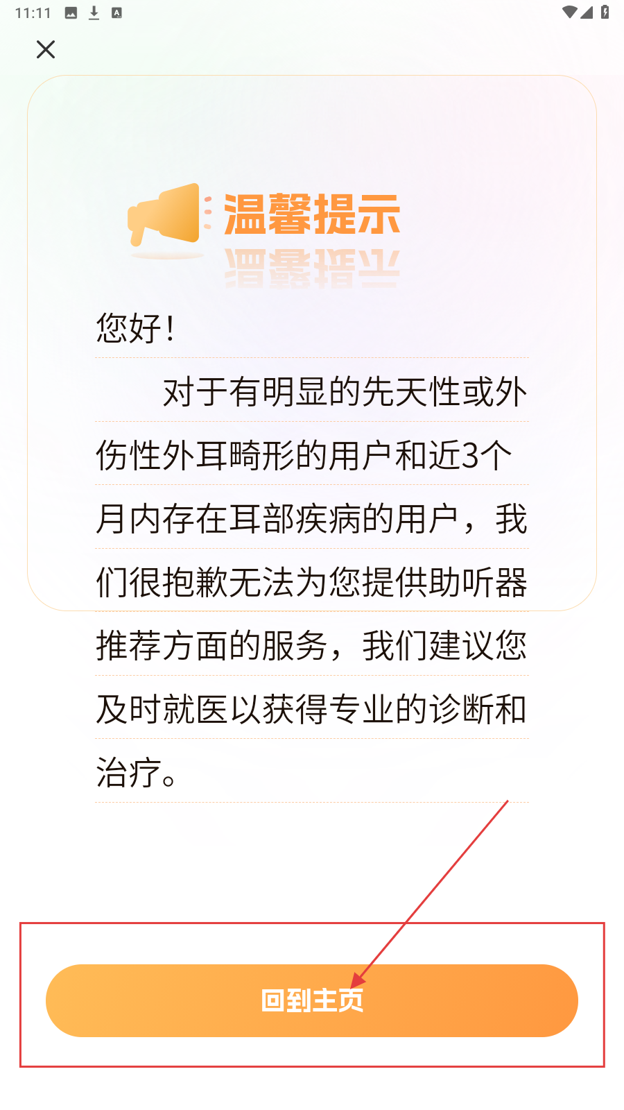 3、测试完成,如若出现【温馨提示】弹窗,点击【回到主页】,可选择重新测试。