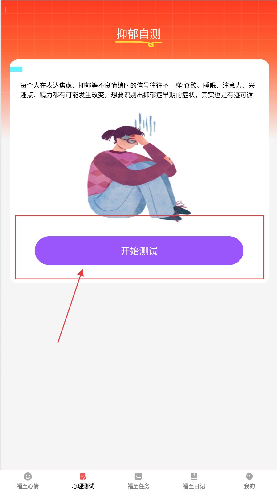 1、打开应用,在【心理测试】页面,点击【开始测试】进行抑郁自测。