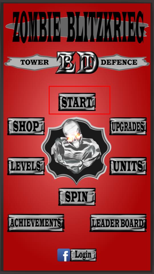 1、点击中间START按钮启动塔防战斗;界面围绕骷髅图标,分布SHOP商店、UPGRADES单位升级、LEVELS关卡等功能入口,可按需进入对应界面。