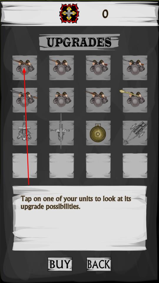 2、进入UPGRADES界面,点击士兵等单位图标,查看其升级可能性,消耗资源提升单位属性,就需要去增强防御战力。