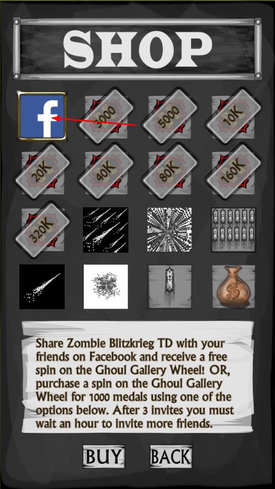 3、在SHOP界面,点击Facebook图标分享游戏,可获Ghoul Gallery Wheel免费旋转机会,也可选择3000、5000等medals额度,购买旋转次数,按提示操作。