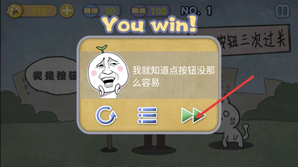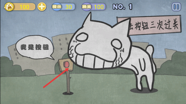 1、第一关看到点按钮三次过关的提示,要注意题目的陷阱,假意点击标有我是按钮的装置,完成通关。