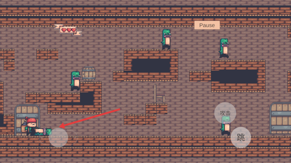 2、利用左侧虚拟摇杆控制移动,遇到绿色敌人时,点击右侧攻击按钮投掷炸弹,消灭敌人推进关卡。