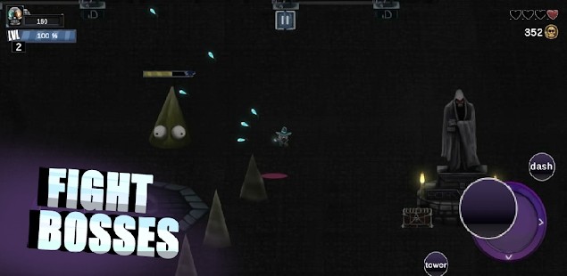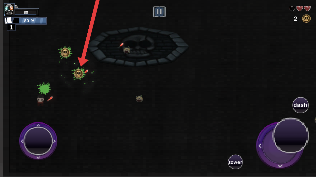 2、遇到敌人需要点击右侧的紫色摇杆,释放攻击的技能来打击消灭敌人,击败敌人后会变成一滩绿色的水。