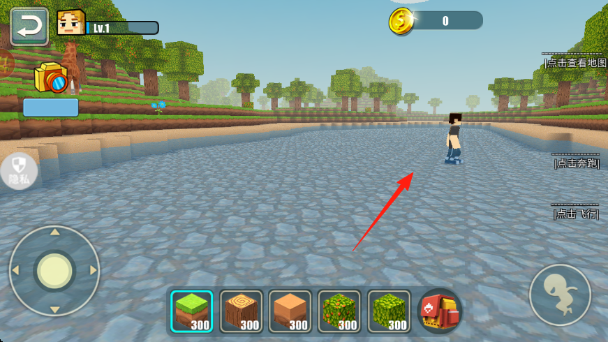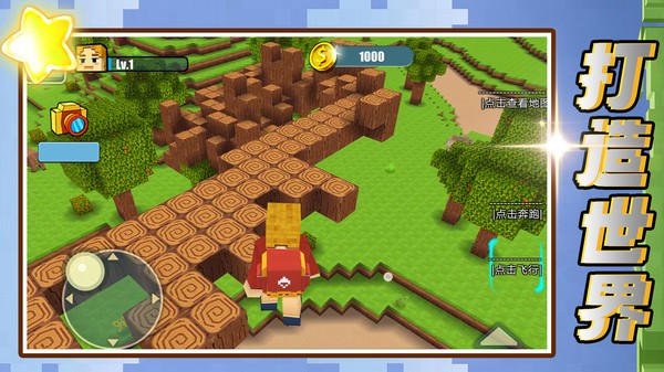 3、继续移动探索,利用不同方块草地等,依据需求搭建、创造,推进沙盒建造玩法,提升角色等级。