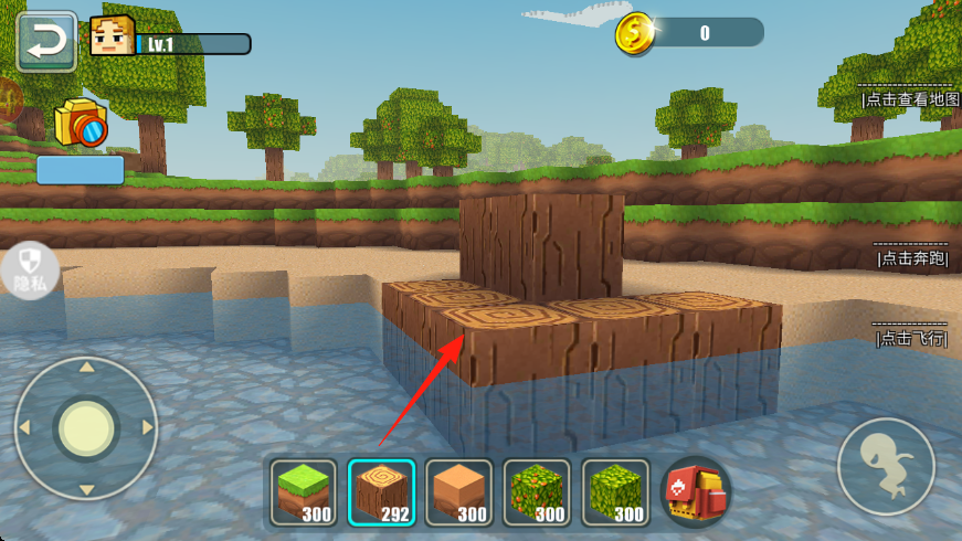2、选择下方木材方块,点击放置,在水中搭建平台,拓展可活动区域,积累建造素材。
