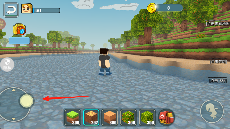1、操控角色左侧摇杆,在水域场景移动,右侧可点击奔跑、飞行等操作,探索环境。