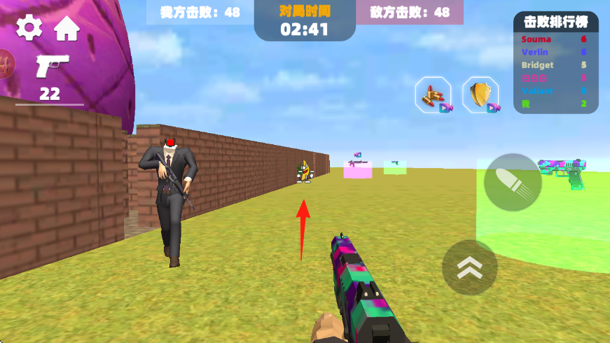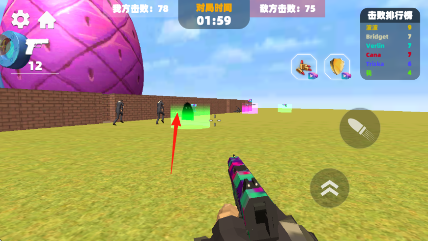1、进入对战,操控角色持枪,瞄准敌方目标如海豹、西装敌人射击,积累我方击败数。