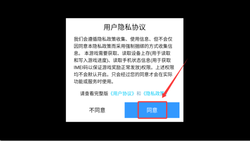 1、启动游戏后阅读并确认用户协议,点击同意按钮进入主界面。