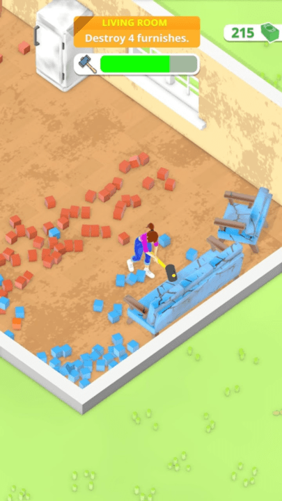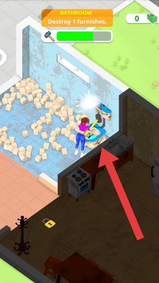2、根据玩法介绍,玩家需要拿起锤子砸向旧的家具,进行翻新,每个场景都需要用到这个道具。