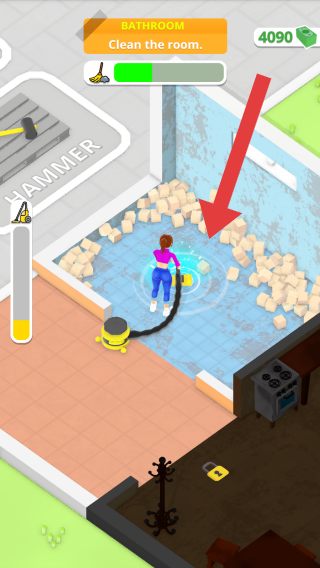 3、将砸完的碎屑需要用到指定的道具-吸尘器,将场地上的垃圾都吸干净,目前金币显示4090,建造需要用到。