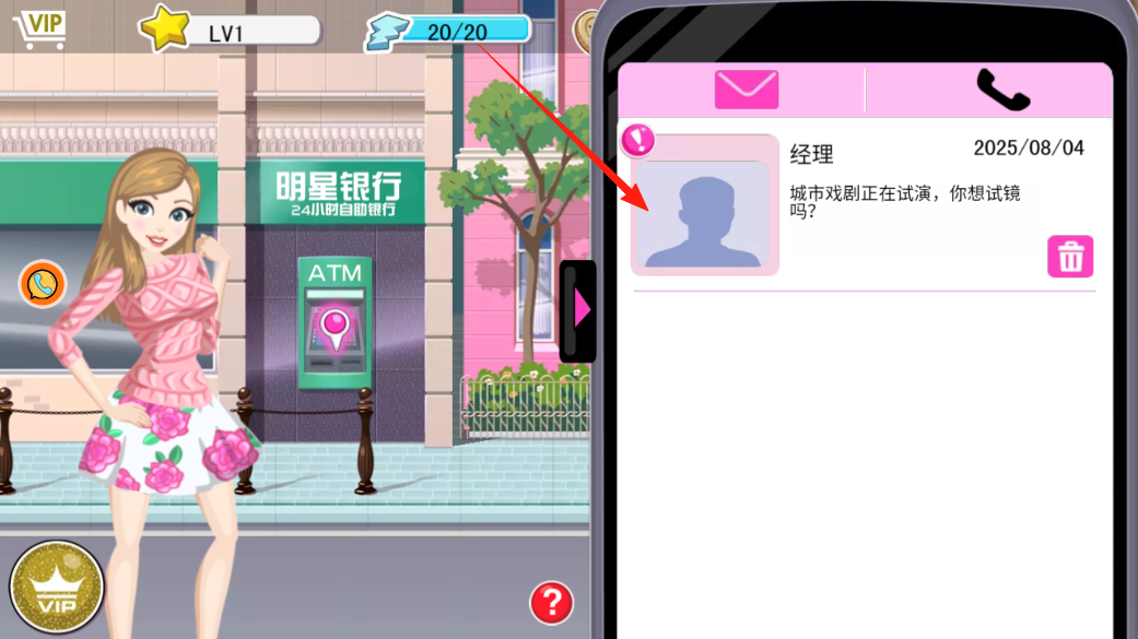 1、在街道场景,手机收到经理短信,说有戏剧试镜机会,点开短信看看内容,决定要不要去试镜,这一步开启新剧情,选对了就能往演员方向发展。