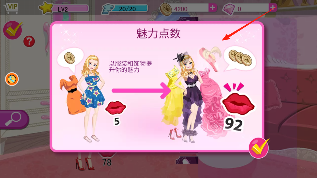 2、进入魅力点数界面,能看到换装提升魅力的机制,用金币买新衣服饰品,给角色换上,每换一套,魅力值就涨,涨到目标数值,说不定能解锁新剧情、新活动。